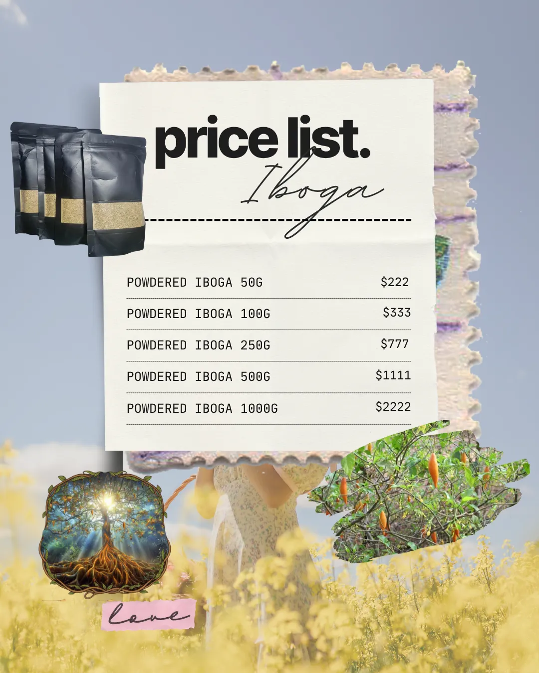 This page is under construction for now. BUT. It is possible to order the medicine already. The medicine comes straight from the jungle of Gabon, the purest source available right now. Straight from the jungle! We ship to everywhere Iboga is legal. We do not ship ibogaine, only the pure root bark, so many places (Like the USA) are legal to ship to. Only France and Italy we cannot ship. Please make sure to get the microdosing guide and read it before using the medicine. As a general rule of thumb, 50g = 1 month supply. In the image below you can see the prices. Please send us an email at [email protected] with your Whatsapp number and your interest and we can make the arrangements :) We are about to democratize the medicine, because the world needs it right now!